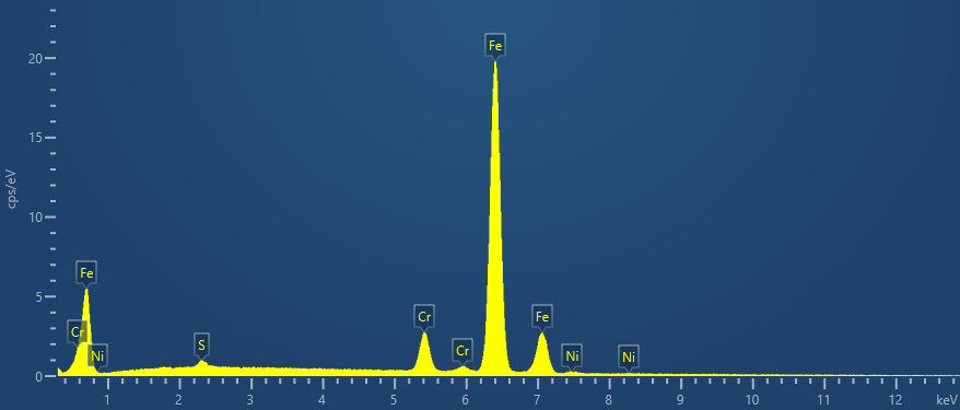 During general operation the spectrum shown in the AZtecLive is a sum spectrum from the full of view. This gives a general overview of the elements detected. When you find a feature of interest and more detail is required, simply switch to spot mode and click on the image (or one of the X-Ray maps) to see the spectrum from the feature.