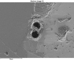 牛津仪器采用 Ultim Extreme 成功地在矿物样品上表征了 Be 元素的分布。图 1 为硅铍矿切片的二次电子图像。该样品经过机械抛光后喷碳处理。经过 LA-ICP-MS 分析可以确认,图中凹坑区域有 Be 元素的存在。但该方法破坏了矿物原有的形态,无法表征 Be 元素的分布。