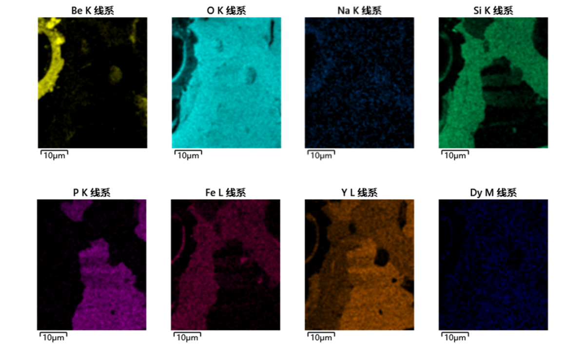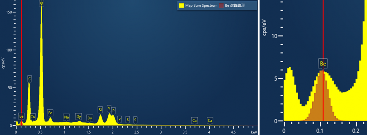 在 5kV 加速电压下,采用 Ultim Extreme 对图 1 中的选区进行 EDS 分析。图 2 中的元素谱图显示该区域有多种元素,除了常见的 Na、Si、O、P、Fe 外,还有稀土元素 Y 和 Dy。在 110eV 谱峰位置清晰地显示了 Be 元素的 Kα 谱峰。