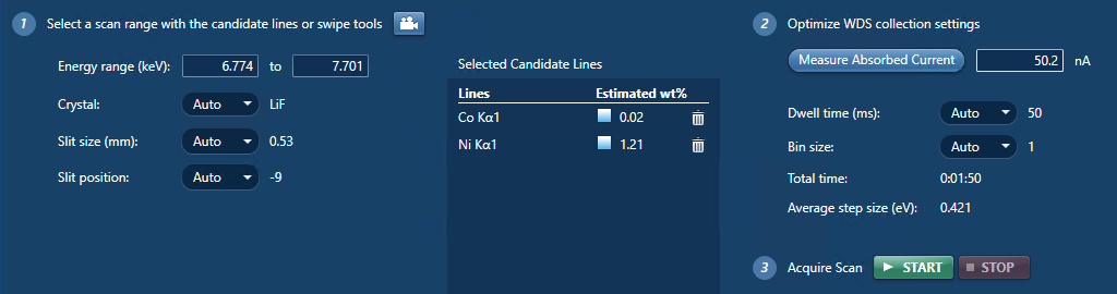 WDS扫描是AZtecWave中的一个新的工作流程,它可以对EDS分析后存疑的元素(如微量元素,受重叠峰影响的元素等)进行更智能的扫描和识别。