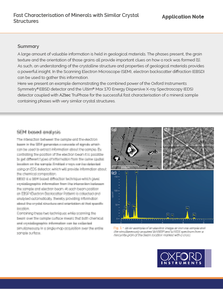 Typically, EBSD analysis of geological samples can be challenging due to the potentially weak diffracted signal of many mineral phases which can result in a limited date acquisition speed. The recent advances made with the EBSD and our Symmetry® detector, overcome these difficulties by enabling fast and high-quality diffraction patterns to be collected.