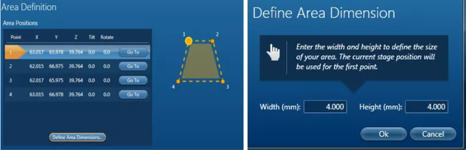 AZtec软件中的LAM功能,可以通过4点定义矩形,或3点定义圆形采集区,如图6左图所示。同时为了提高不同样品间测试结果的可比性,也可以定义相同的检测面积,如图6右图所示。