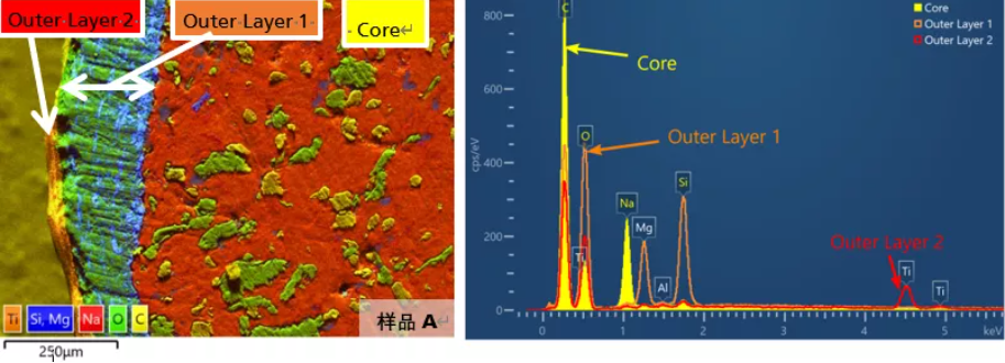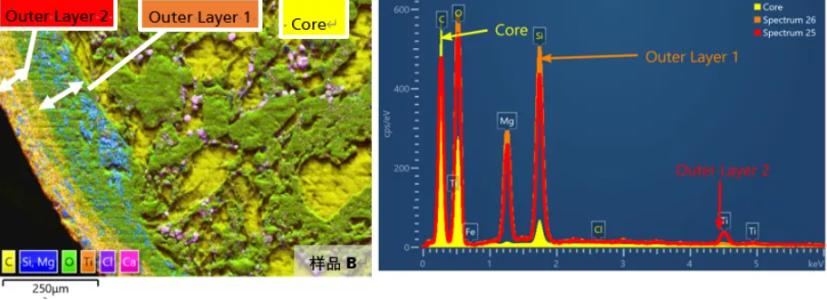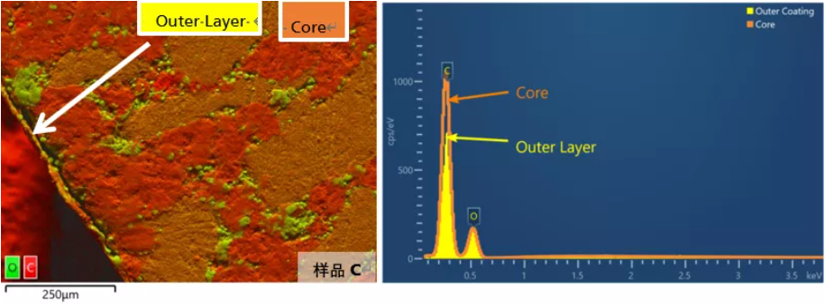 本例选择三种止痛药片,截面抛光后喷碳处理,放入扫描电镜中进行表面形貌及元素分布的观察。三种止痛药片分别为样品A:原研药,B:宣称与A具有相同成分的仿冒药,C:宣称具有与A相同止痛功效的无标药。很多药剂都具有双层包衣,由片芯向外第一层(Outer Layer 1)主要起到光滑表面作用,向外第二层(Outer Layer 2)增加口感,易于吞服。选择合适的位置对样品做元素含量及分布观察,如图5所示。