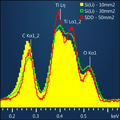 图2 不同探测器类型的谱峰,牛津仪器SDD硅漂移探测器改进谱峰拖尾的探测,提高元素识别准确性