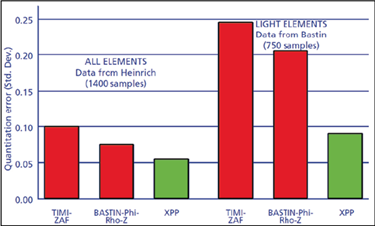 XPP(eXtended Pouchou and Pichoir)法是用指数描述深度分布函数曲线的形状。该方法对吸收严重的试样,例如重元素与轻元素存在于同一试样的定量分析时,定量结果明显好于其他ZAF法或PRZ方法。由美国电子探针专家Heinrich提供的1400个合金试样,及Bastin教授提供的750个轻元素试样进行定量结果表明,XPP方法得到的所有元素的标准偏差,均优于ZAF法及一般PRZ校正方法[1]。图3为这些试样分别用ZAF、ϕ(rz)和XPP校正方法时,分析结果的标准偏差,可以明显看到使用XPP修正方法的定量结果误差小,准确性高。