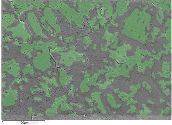 因为乳糖区别于其他辅料成分的是含氧量较高,据此可直接通过氧(O)含量差异将乳糖部分选出,更直观的观察其形貌及分布情况。利用牛津仪器能谱(EDS)对轻元素定量准确性的优势,依照制剂内原辅料C/O比例不同对乳糖标记,通过图中绿色覆盖的区域可以明显看到,参比制剂中使用的乳糖为原始乳糖,如图4所示。该乳糖形貌不规则、棱角更加分明,其状态与乳糖制备工艺有关,进而可以帮助制剂工程师快速确定制剂的原辅料牌号与种类、粒度分布及分布均匀性等工作,并反推制剂的生产工艺及合成条件。