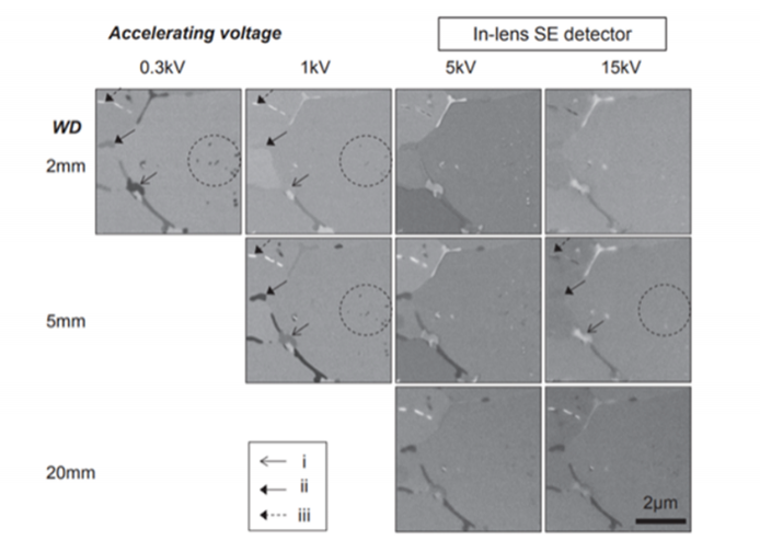 日本钢铁工程控股公司佐藤博士对钢中细小夹杂物的分析工作很好地展示了不同扫描电镜 SEM 成像条件对电子图像的影响。图 1 所示为 2.25Cr-1 Mo 钢在不同加速电压及工作距离下所观测到的不同碳化物的衬度。图 1 中的 i,ii,iii 箭头所指(i代表M23C6,ii代表M6C,iii代表AlN)及圆圈内的位置(M2C)是不同种类的碳化物,总体而言,随着电压的降低和工作距离的缩短表面的碳化物逐渐显现其清晰的形貌及分布位置。