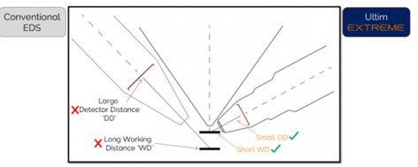 图 2 传统EDS及Ultim Extreme与电子束和样品的相对几何关系的示意图