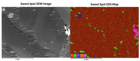 图 3 所示为一离子抛光后的样品的电子图像(左)及元素分布图(右),工作电压为 3kV,工作距离为 4mm,元素分布图使用牛津仪器 Ultim Extreme 采集。从右侧的元素分布图可以轻易区分出红色的基底(不锈钢)和至少 3 种第二相,它们分别为粉红色的富 Ni 相,绿色的富 Cr 相及蓝色的富 Mo 相。在左侧的电子图像中,由于抛光的缘故,富 Cr 相并不清晰,EDS 可以帮助快速定位、区分不同的第二相,提供形貌之外的元素信息。