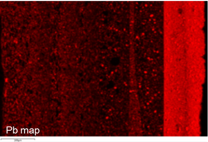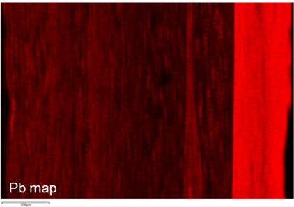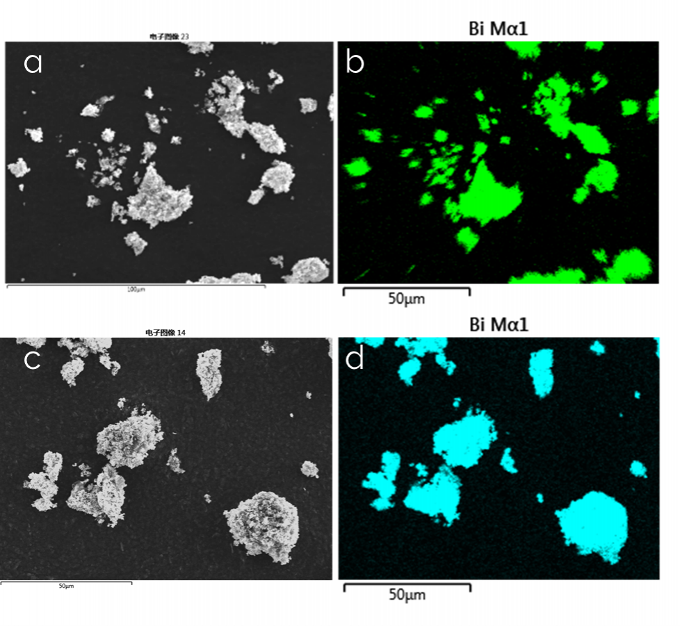 常用的导电胶带内有大量气孔,在真空中这些气孔坍塌胶带发生变化,粘在其上的样品也会跟着移动。使用液体碳浆可解决此类问题。图 5 所示为 10kV 下含Bi粉末撒在碳胶带上和用液体碳浆进行固定的 EDS 分析结果,结果表明,即使是导电的大尺寸样品,使用 C 胶带进行固定(图5ab)也会发生颗粒的形状变化或者展宽等,而固化后的 C 浆(图5cd)则具有很高的稳定性,EDS 元素面分布结果与电子图像完全匹配(碳浆选购点击牛津仪器在线商城)。