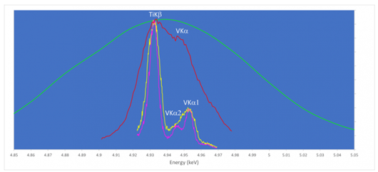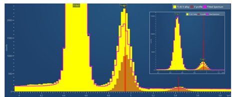 以含有过渡元素钛 (Ti) 和钒 (V) 的材料为例(如图1所示),Ti Kβ1 (4.932 keV) 和V Kα1 (4.952 keV) 的能量差仅为20 eV;考虑到V Kα2(4.945 keV)的影响,这一差别实际上会更小。如此严重的谱峰重叠给Ti-V-Al合金和Ti-V矿物的定量分析带来了很大挑战。一个合格的能谱探测器的分辨率为120-130 eV,因此无法仅通过EDS探测器分离这两条谱线。从以下Ti-6Al-V合金的EDS谱图中可以观察到V Kα 信号增加了Ti Kβ 峰的高度,这一现象仅在使用AZtec软件显示两种元素的各自贡献时才明显。