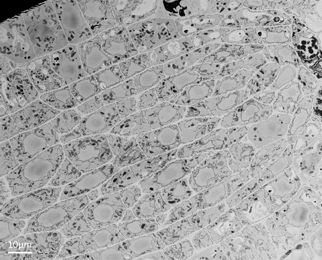 Figure 1. Block-face image of an Arabidopsis root tip imaged with backscattered electrons and showing cell ultrastructure.