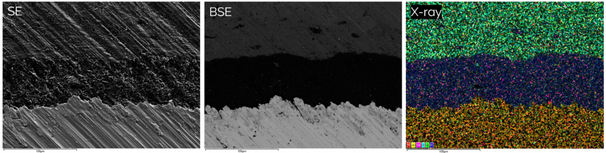 Figure 3 showing the differences between topographical secondary electron (SE) images, backscattered electron images (BSE) showing differences in density and x-ray signals revealing the distribution of elements in a bone implant (sample courtesy of Zhidao Xia, Swansea University).