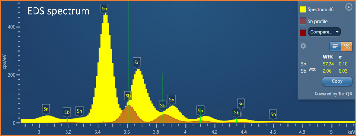 图1:Sn-Sb焊料的EDS谱图,其中Sn Lβ线(3.662 keV)与 Sb Lα线(3.605 keV)有重叠。右侧迷你视窗中的点分析结果显示该样品的Sb含量低于5 wt.%。Sn与Sb的浓度分别由AZtecWave中集成的EDS和WDS模块同时测量获得。