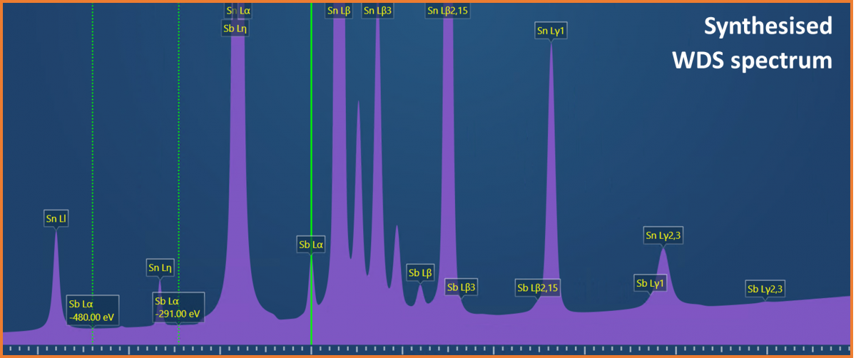 图2:Sn-Sb焊料的WDS合成谱图。此处的横坐标采用了与图1相同的能量范围,读者可以看到WDS的能量分辨率明显优于EDS。