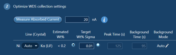 图3:AZtecWave界面截屏。软件会根据测量的吸收电流、估算的Ni含量和预期的定量不确定度自动计算谱峰与背底计数时间;或者在用户输入谱峰/背底采集时间后计算当前束流下可能得到的定量不确定度。