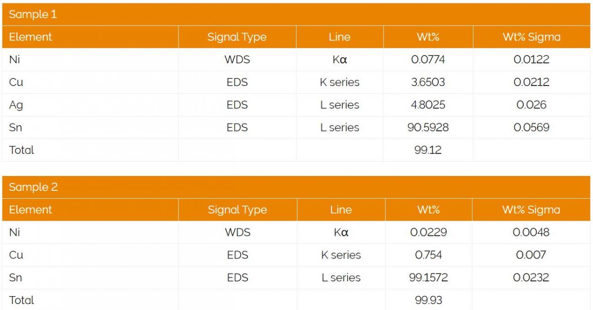 第二个案例展示了使用AZtecWave分析Sn-Cu和Sn-Ag-Cu焊料中痕量Ni元素的过程。Zhao等人在2019年提出,添加少量Ni(<0.5 wt.%)不仅可以改善焊料性能,还有助于减少焊接处孔洞的形成及Sn/Cu的相互扩散[1]。Rosie分别通过EDS和AZtecWave波谱仪同时测量了以上两种焊料中主量-微量元素(Sn、Ag、Cu)和微量-痕量元素(Ni)的含量。如下表所示,Sn-Ag-Cu和Sn-Cu焊料中Ni含量分别为774 ± 122 ppm和229 ± 48 ppm。该案例充分说明AZtecWave可以轻松区分Ni含量低于800 ppm的不同焊料,在理想情况下测量误差仅为±50 ppm。