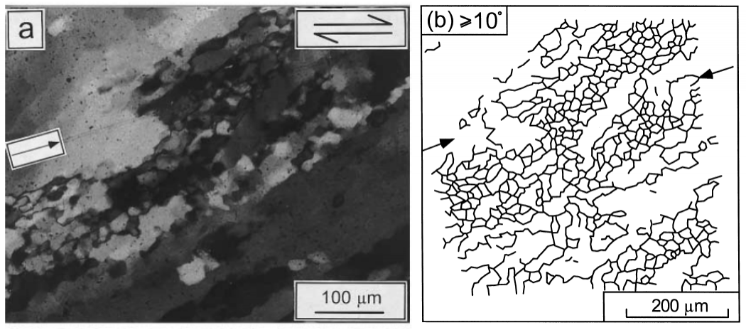 上图是九十年代中期风格的EBSD结果。结果来自于半自动EBSD分析石英剪切带,展示了偏振光显微照片(左)和相同区域由EBSD生成的大角晶界面分布图。整整两天才完成的面分布图由738个EBSD测试点组成,接下来计算并绘制1912个晶界取向差,还需要更多天的时间才能完成。摘自Trimby et al. (1998), Journal of Structural Geology, 20。