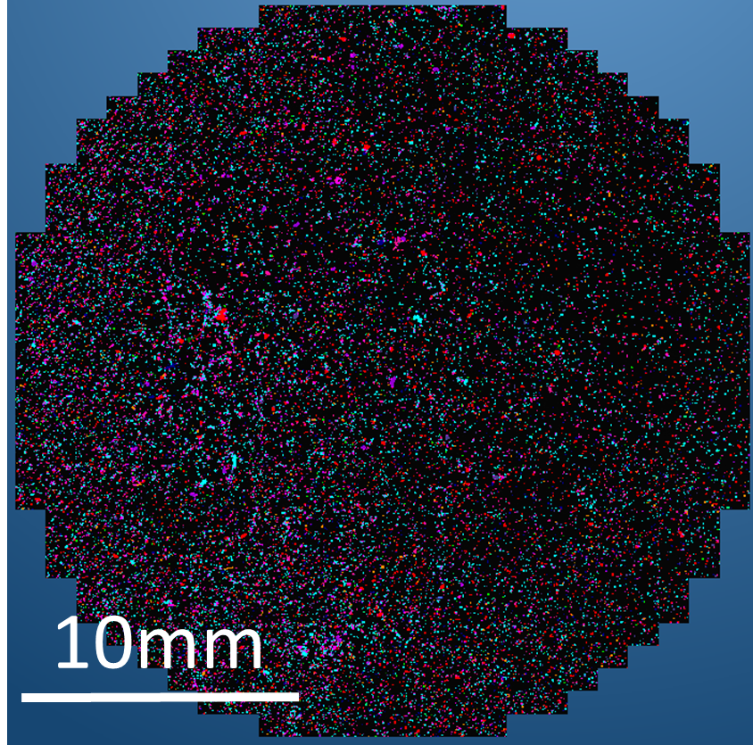 Normally the entirety of a filter will be analysed automatically to ensure every particle is found. Fig. 3 shows a montaged image from a total circle area in excess of 506mm2. 31249 particles were detected, analysed, and classified in real time. Particles are coloured by their classification as shown in Fig.4.