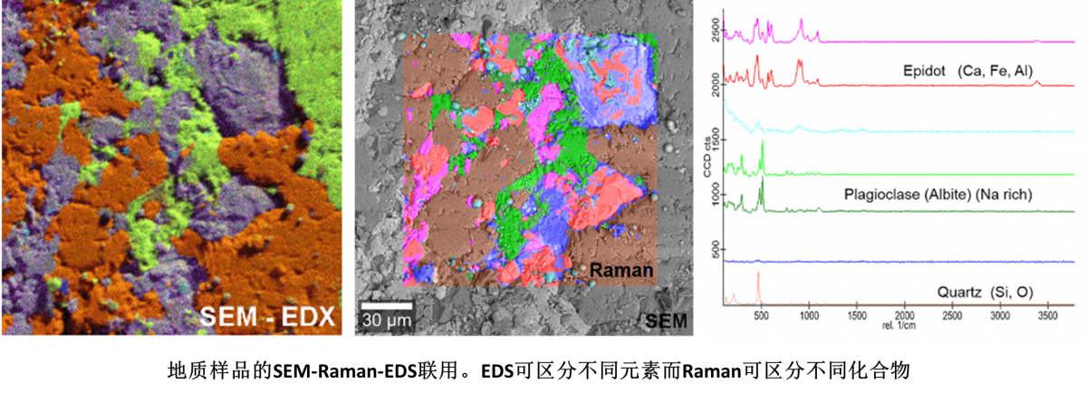例如可以通过扫描电镜平台,同时利用拉曼及EDS进行元素表征,获得更多信息,如成分、应力、物相、晶型等;通过关联技术使原子力显微镜和扫描电镜及EDS、EBSD对相同区域进行表征,获得更多力学、电学等信息,这些设备与EDS的联用,均可相互优化分析过程及拓展应用领域。