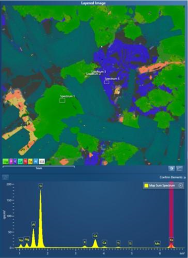 随着大面积SDD探测器的出现,尤其是牛津仪器仪器Ultim Max系列的推出,可在高计数率条件下采集高质量EDS数据,在不同样品及不同电子显微镜条件下,几秒钟或几分钟内可完成X射面分布图的采集。使用AZtec的 AutoLayer功能可自动构建分层图像,将样品的形貌和主要元素的分布叠加一起,直观显示元素分布与形貌的关系。相比单色的电子图像及元素分布,AutoLayer结果可展现更多信息。由于在面分布中的每个像素存储了所有X射线信息(智能面分布图SmartMap),可利用面分布结果创建一个虚拟样品,离线条件下进行后续分析(例如,从面分布图选取一个小区域进行谱图重建)。