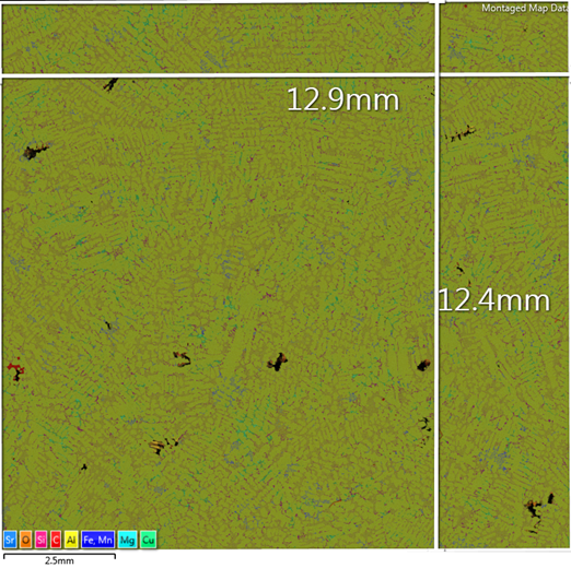 常规能谱分析,仅可在数百微米的单个视场下进行。过低放大倍数引起的电子束偏离垂直入射条件,可引起定性定量分析的误差。大面积分析功能的出现,通过自动采集多个视场的元素分布及定量信息以及随后的自动拼接,可实现厘米尺度的元素分析,将微观与宏观分析连通。下图为利用大面积分析功能,分析了某Al合金样品744个视场,12.9mm*12.4mm区域的元素分布。