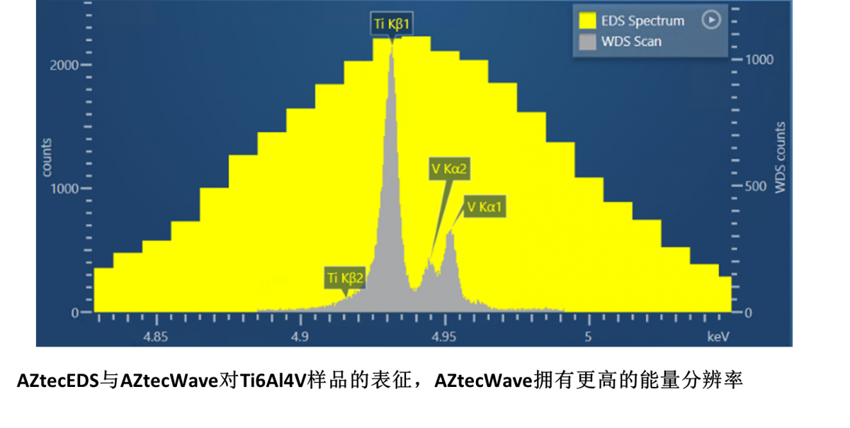 AZtecWave为罗兰圆架构波谱仪,罗兰圆半径210mm,它与牛津仪器AZtecEDS基于同一软件平台AZtec。相比EDS,具有更高的能量分辨率和更低的检测限。AZtecWave与AZtecEDS联用,主元素可以使用快速EDS分析,痕量及严重谱峰重叠元素使用能量分辨率更高/检测限更低的WDS波谱法分析。EDS数据更可用于设置WDS最佳采集条件,大幅度简化繁琐的WDS参数设置及分析效率。下图显示了Ti6Al4V样品AZtecEDS和AZtecWave分析结果分辨率的差异。
