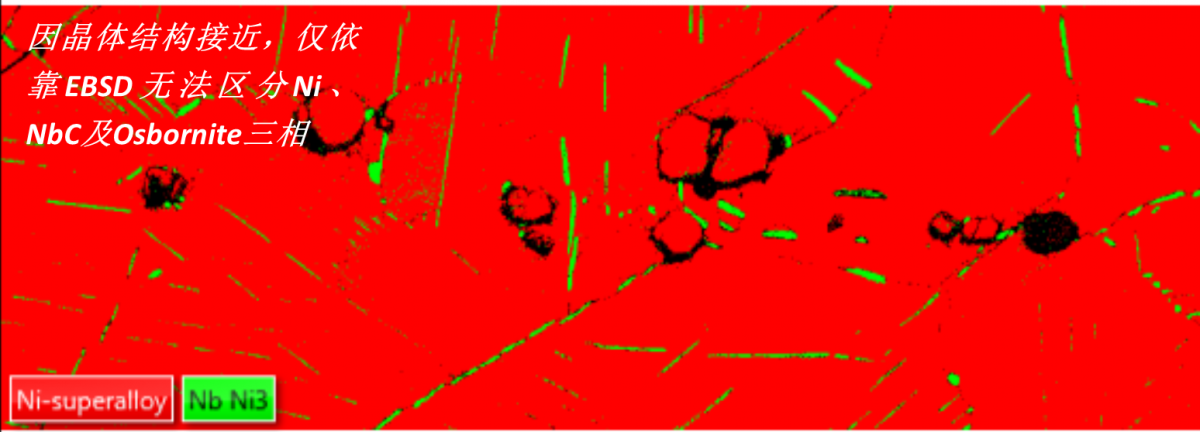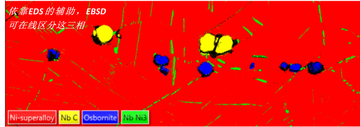 AZtecEBSD 在EDS成分分析的同时,可获得样品的物相、取向、变形等信息,它同样基于AZtec软件。EDS也可用于辅助区分结构近似的物相分析。结合基于CMOS传感器的Symmetry S3 EBSD探测器,图像分辨率及采集效率均有了大幅度的提高。同时,数据后处理软件 AZtecCrystal给出了全新的体验。如下图为利用EDS辅助区分晶体结构近似的Ni, NbC和Osbornite相。