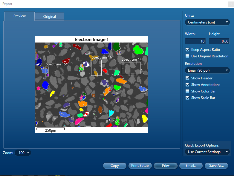 除了常见的图表、word报告输出外,AZtec还可以导出不同格式的图像(png, bmp, jpg, tif)、元素面分布图和线分布图结果,用于Word、PowerPoint编辑或者印刷出版。