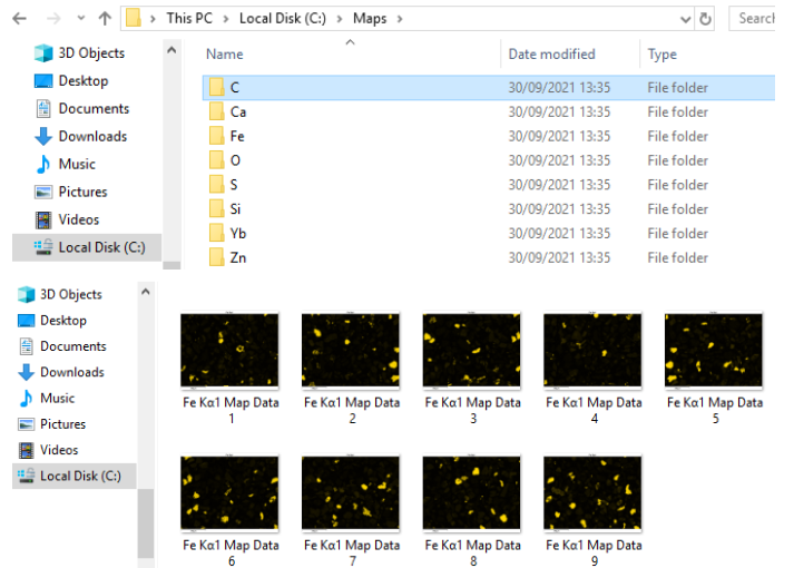 在导出元素分布图时,选择“EDS分布图”选项,然后选择导出分布图的方式。可以将到图像导入到点位置命名的文件夹或者元素文件夹里。导出完成后,在目标文件夹里可以看到新创建的元素文件夹。比如打开Fe文件夹,可以看到所有位置上的Fe元素分布图(如图15)。