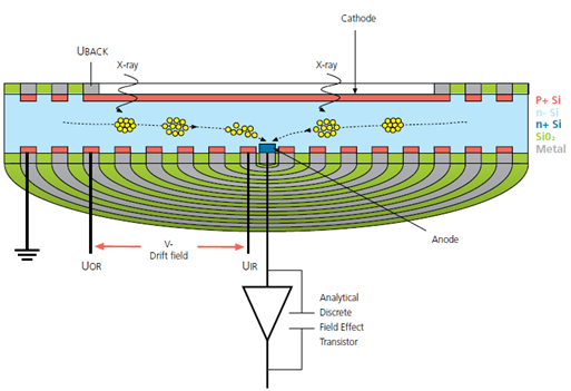 The EDS detector converts the energy of each individual X-ray into a voltage signal of proportional size. This is achieved through different stages. The SDD is responsible for the first stage, which is the conversion of X-ray into charge by ionisation of atoms in the semiconductor crystal.
