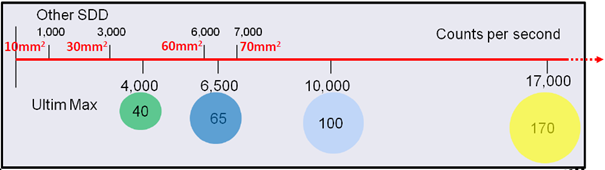 It is a challenge to maintain high performance of large sensors sizes . For example, detectors with large sensors require higher power to cool to the same temperature. The environmental, cooling technology and engineering challenges are significant if the detector current noise, which also influences the resolution, is to be kept to a minimum and stable over time. Using the same small anode on all sensor sizes is important to ensure large area SDD sensors can maintain good resolution at very high-count rates, which they can more easily achieve due to their size.