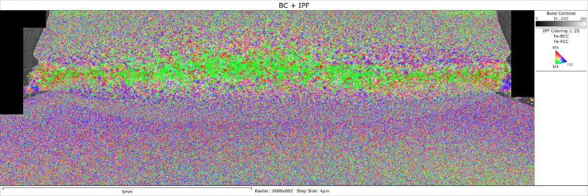 通过结合粗步长大面积数据采集及细步长详细采集,即使分析诸如焊缝一类复杂的样品,EBSD也可以做到快速准确统计需要的信息。