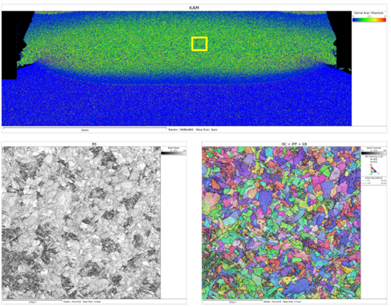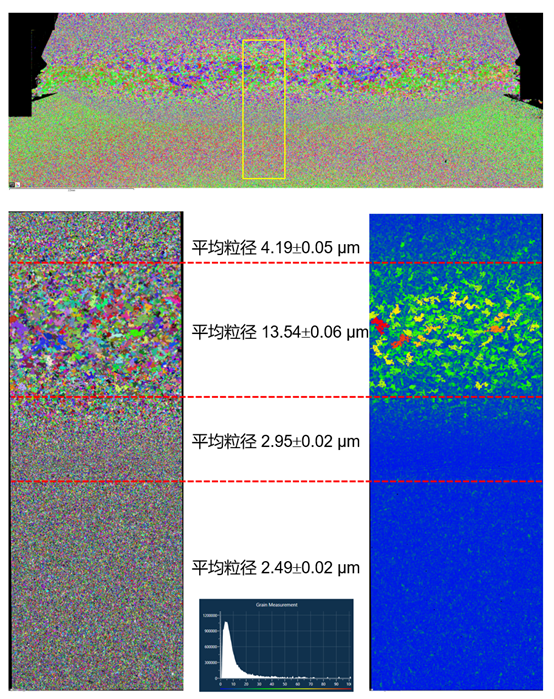 当我们拿到一个焊缝样品时,可以先用较粗的步长,比如4μm,快速地对整个焊缝区域表面做一个粗略的扫描。通过对焊缝区域的概览,可以知道从上到下,焊缝分为多个典型的组织区域,各区域的取向及晶粒大小各不相同。