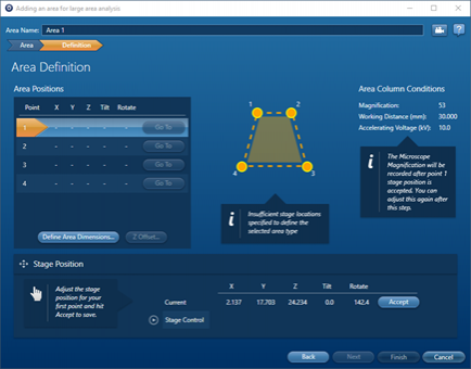 在数据采集过程中,AZtec会自动将样品从一个视场移动到下一个视场,因此样品的定位必须确保这些移动是安全的。在初始设置时,通常在样品表面,利用三维坐标(x、y、z)可以定义4个点围成的四边形。这样,在视场之间移动样品台时,AZtec会根据x、y轴计算如何调整样品台的z轴以保持样品表面聚焦。这一点很重要,否则,如果样品表面不与SEM样品台平行,样品就会偏离焦点。