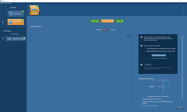 为了克服这个问题,有一个面向用户的校准步骤。在该步骤中,当样品台沿x方向移动时,跟踪样品上的特征。此步骤可从Assist软件访问,但在大多数系统上,不作此要求,因为SEM会根据SEM校准数据自动调整扫描方向。此外,对于EBSD分析,我们将调整扫描旋转校正作为样品对齐过程的一部分,以确保绝对方向正确,这也确保在大面积拼接时保持视场之间的对齐。