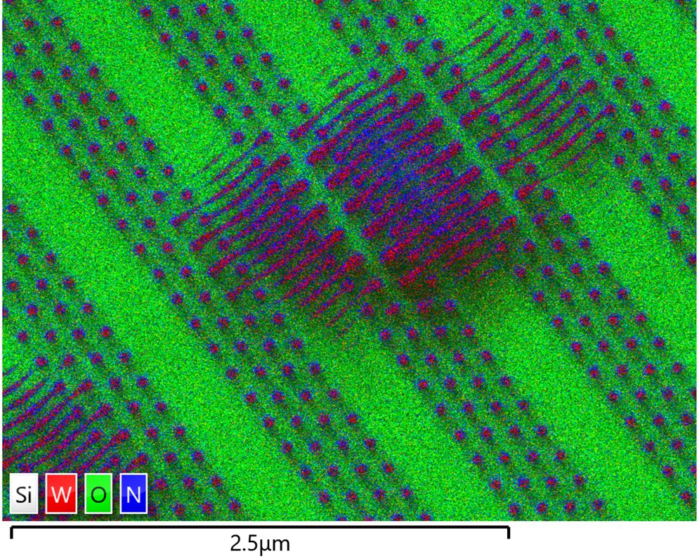 NAND闪存芯片的元素面分布图,其中20 nm左右的结构清晰可见。数据由Extreme探测器在3 kV下采集并对Si Kα (1.740 keV) 和W Mα (1.774 keV) 进行了去卷积处理。