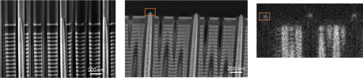 Fig. 1 Left: sample prepared by conventional milling with curtaining; Centre: sample prepared by backside thinning to avoid curtaining; Right: nitrogen EDS map from backside thinned sample.