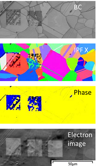 Fig. 4 Band contrast, orientation, and phase maps (austinite yellow, ferrite blue) with corresponding electron image. Three regions were exposed to a 30 keV, 1 nA. Ion beam exposure times decreased left to right.