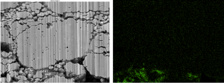 Another potential effect of ion milling on EDS analysis is contamination. Contamination occurs when ions used to mill are implanted, or the milled material redeposits on the sample. Redeposition is typically observed at (but not limited to) the bottom of a cross-section. The redeposited materials composition is a combination of the milled material (from the sample or a support structure like a liftout grid) and ions from the ion beam. The example below (fig. 2) shows gallium contamination of solid-state lithium-ion battery (contains no gallium). In the cross-sectional EDS map, a significant amount of gallium is observed at the bottom of the cross-section, but importantly not at the top in the particles being analysed.
