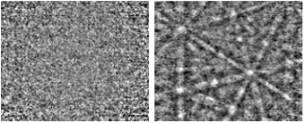 It is not just the chemistry of a sample which can be affected by ion milling, the crystal structure can also be impacted. A well-known example of this is the amorphization of silicon. The EBSD signal images in fig. 3 were taken from the same crystal of silicon, however one was taken after been polished at 30 keV and 500 pA (no Kikuchi pattern produced), the other at 5keV and 500pA (clear Kikuchi pattern). The lack of a pattern is not because of the detector, but because EBSD is a surface sensitive technique, and the surface has been amorphized meaning no patterns are generated.