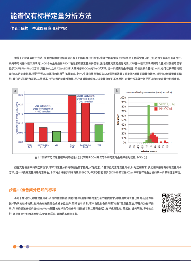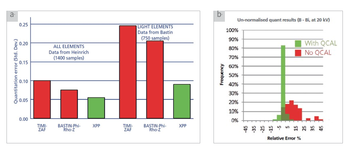 得益于XPP基体校正方法,大量的实际测试结果显示基于扫描电镜(SEM)下,牛津仪器能谱仪(EDS)系统无标样定量分析已经达到了很高的准确性[1]。采用不同的基体校正方法对1400个合金样品和750个轻元素样品定量分析显示,无论是重元素还是轻元素,XPP基体校正方法得到的含量相对偏差均显著低于ZAF和Phi-Rho-Z方法(见图1a)。之后AZtecEDS引入硬件修正QCal的Tru-Q®算法,进一步提高定量准确性,即使元素含量约1wt%,也可以获得相对误差仅5%的定量结果,远好于无QCal算法的结果[2](如图1b)。此外,牛津仪器能谱仪(EDS)探测器改善了低能端X射线的能量分辨率,对特征X射线谱峰的峰形、峰位的识别更为准确,从而提高了轻元素的定量准确性。用户遵循能谱仪(EDS)定量分析的基本原则,定量分析准确性甚至可以和有标定量分析相媲美。
