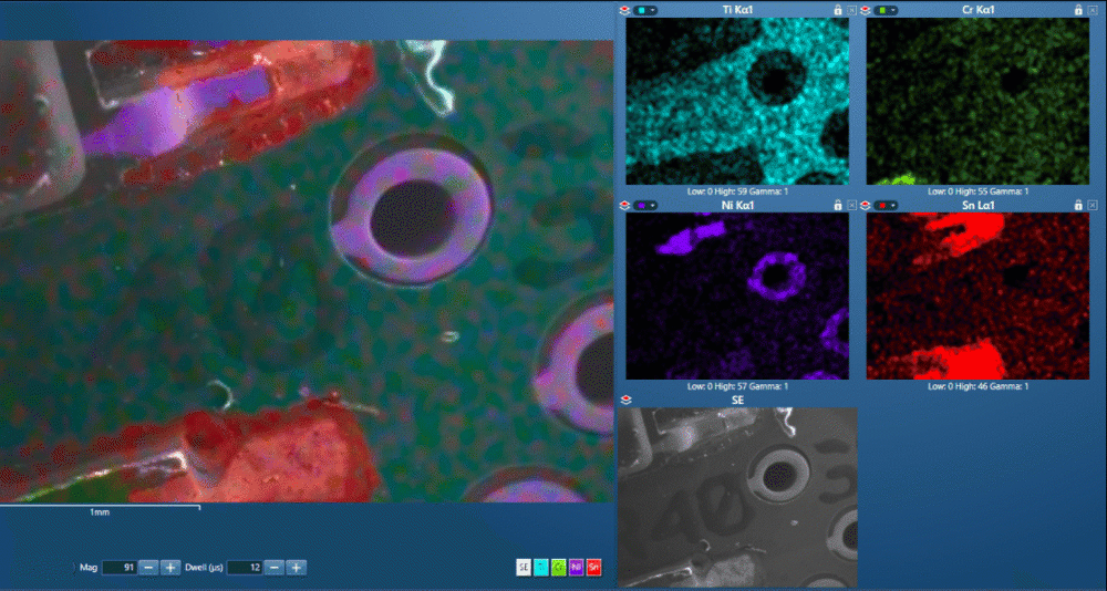 将这些缺陷在光学图像上标记并导入 AZtecLive 后,可快速重新定位这些区域,利用 SEM-EDS 进行详细分析,从而确定污染物来源。