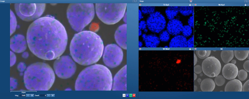 高品质金属 3D 打印要求使用超高纯度(>99.9%)粉末,但其检测难度较高,因为污染物往往仅以痕量浓度存在。视频展示了如何通过实时化学成分成像,识别出源自其他粉末的细小钨颗粒污染物分布;进一步分析还检测到少量镍基高温合金颗粒。