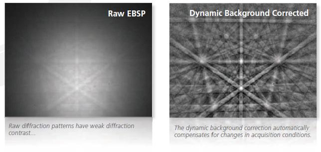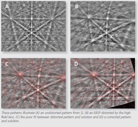 在某些应用中,从SEM镜筒中泄漏的高磁场会导致衍射花样变形。变形会导致衍射带弯曲,并改变花样中心,而AZtec则可以自动校正。