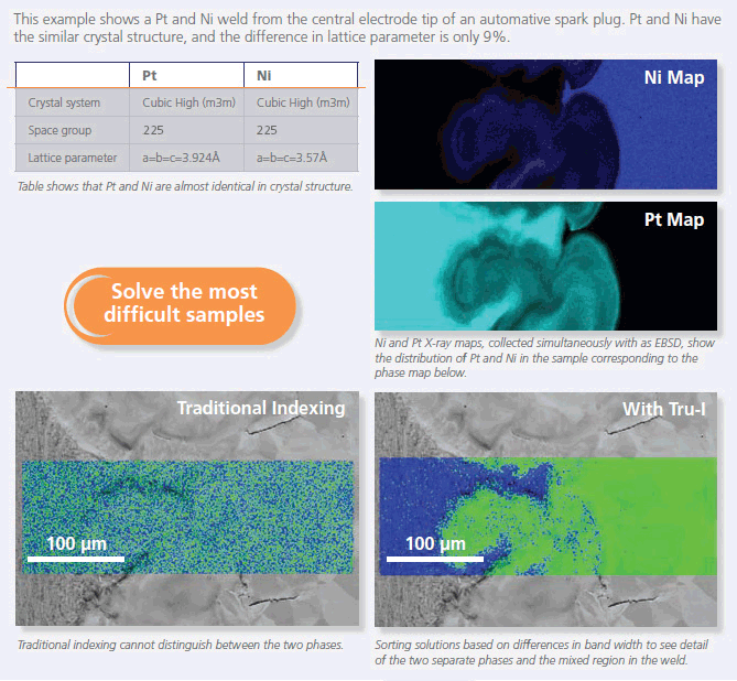 AZtec可以通过对比衍射带宽度来区分相似晶体结构,从而确定正确的相。