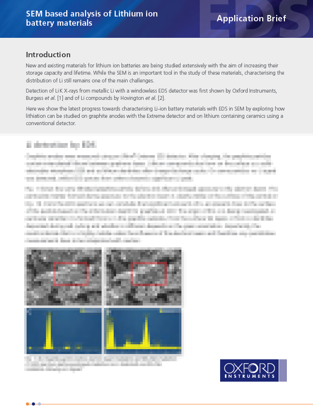 Here we show the latest progress towards characterising Li-ion battery materials with EDS in SEM by exploring how lithiation can be studied on graphite anodes with the Extreme detector and on lithium-containing ceramics using a conventional detector.