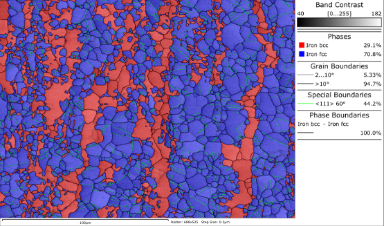 传统上,用EBSD测量马氏体结构是一个挑战。在这里,Symmetry提供的灵敏度和花样细节使马氏体不锈钢获得了优异的结果。