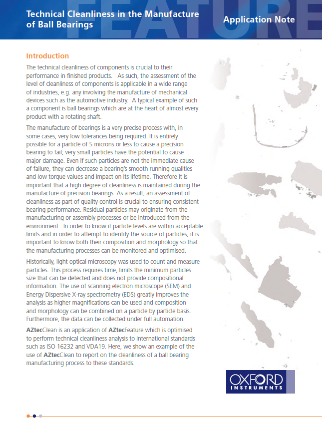 The manufacture of bearings is a very precise process with, in some cases, very low tolerances being required. It is entirely possible for a particle of 5 microns or less to cause a precision bearing to fail; very small particles have the potential to cause major damage. Even if such particles are not the immediate cause of failure, they can decrease a bearing’s smooth running qualities and low torque values and impact on its lifetime. Therefore it is important that a high degree of cleanliness is maintained during the manufacture of precision bearings. As a result, an assessment of cleanliness as part of quality control is crucial to ensuring consistent bearing performance. Residual particles may originate from the manufacturing or assembly processes or be introduced from the environment. In order to know if particle levels are within acceptable limits and in order to attempt to identify the source of particles, it is important to know both their composition and morphology so that the manufacturing processes can be monitored and optimised.