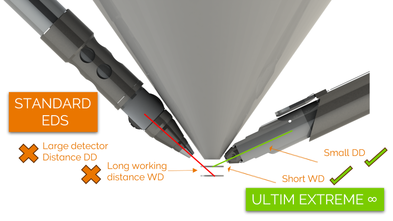 Ultim Extreme ∞(“Infinity”)是为超高分辨率场发射扫描电子显微镜(FEG-SEM)设计的开创性解决方案。即便是在达到SEM分辨率极限的条件下,这款独特的探测器仍能够在极低的加速电压下(例如1-3 kV)和极短的工作距离内收集能量色散X射线光谱(EDS)数据,从而分析纳米材料和表面成分。由于采用了独特的技术方案,如特殊形状的传感器、无窗设计、更近的探测距离、小型电子陷阱以及极高的立体角,该探测器具有了更强的灵敏度。